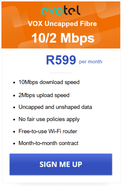 Vox fibre data is premium uncapped and unshaped data with no fair usage policy, ideal for home users with large bandwidth requirements. Vox fibre also has low latency which is perfect for gaming, voice and video streaming applications.